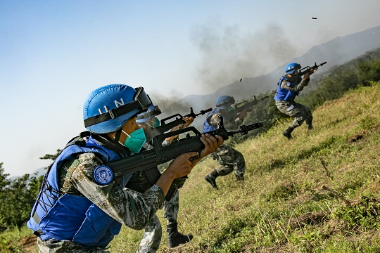图为在“共同命运-2021”国际维和实兵演习中,我方参演分队正在展开战斗队形。焦光辉 摄