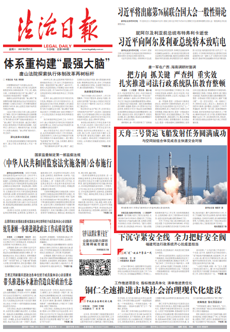 天舟三号货运飞船入轨后顺利完成入轨状态设置,于北京时间9月20日22时08分,采用自主快速交会对接模式成功对接于空间站天和核心舱后向端口,整个过程历时约6.5小时。天舟三号装载了航天员生活物资、舱外航天服及出舱消耗品、空间站平台物资、部分载荷和推进剂等,与天和核心舱及天舟二号组合体完成交会对接后,转入三舱(船)组合体飞行状态。