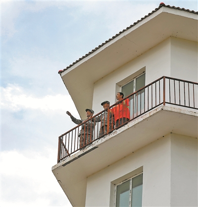 张连印(左一)在瞭望塔上观察森林防火情况。