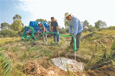张连印(右一)与老伴王秀兰、儿子张晓斌一起为树苗浇水。