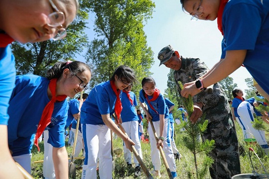 图为张连印带着孩子们植树造林。丁美宁 摄