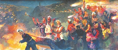 油画《延安火炬》由我国当代著名油画家蔡亮创作,表现的是1945年抗战胜利后,延安军民举行火炬游行、欢庆胜利的情景。