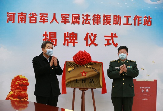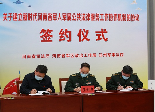 启动仪式上,河南省司法厅、河南省军区政治工作局、解放军郑州军事法院共同签署了《关于建立新时代河南省军人军属公共法律服务工作协作机制的协议》,并为“河南省军人军属法律援助工作站”揭牌。