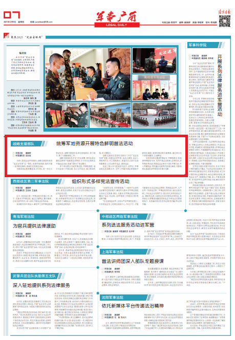为提高普法教育覆盖面、针对性,进一步壮大普法队伍,战略支援部队各单位因地制宜、借力地方,做了大量基础性工作。