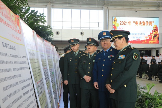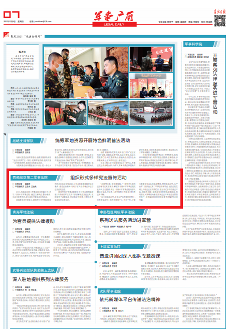 “在全面依法治军、全面从严治军新的征程上,只有将宪法至上的理念铭刻于心、外化于行,才能不断激发官兵弘扬宪法精神,贯彻依法治军、从严治军。”西部战区第二军事法院领导说,战区法院在网上开设宪法宣传周栏目,推出形式多样的普法产品,增派两名网上值班法官及时提供法律咨询,利用营区大屏幕滚动播放国家宪法日和宪法宣誓制度短片,发放编印的《防范非法集资诈骗》等法律书籍。