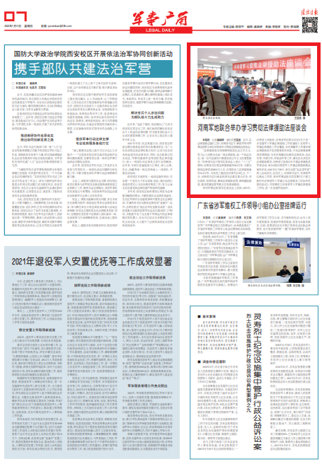 郑州军事法院领导在座谈会上讲到,2015年,河南省人民政府、河南省军区联合印发《关于进一步加强军人军属法律援助工作的通知》,实现军人军属法律援助工作全覆盖,对河南籍军人军属申请法律援助免予经济困难条件审查,不设法律援助事项范围限制;为非河南籍官兵做好法律咨询、诉讼代理、申请引导、异地协作等工作,满足官兵多层次法律援助需求。河南省已连续11年开展法律援助进军营活动,举办6届河南省军人军属法律援助精品案件评选。2021年11月30日,承办全国“宪法进军营”线上启动仪式,在仪式上,河南省司法厅、河南省军区政治工作局、郑州军事法院共同签署《关于建立新时代河南省军人军属公共法律服务工作协作机制的协议》,并挂牌成立河南省军人军属法律援助工作站,进一步加强军地协作。