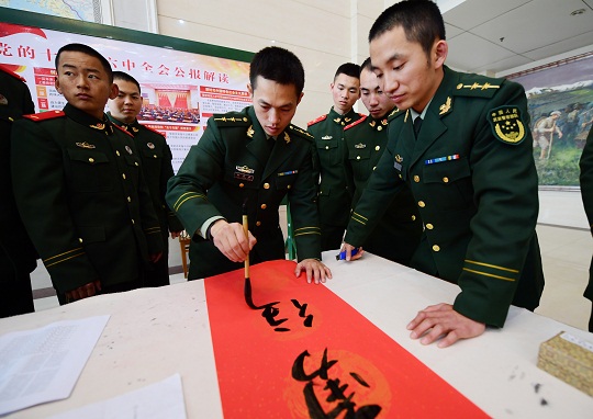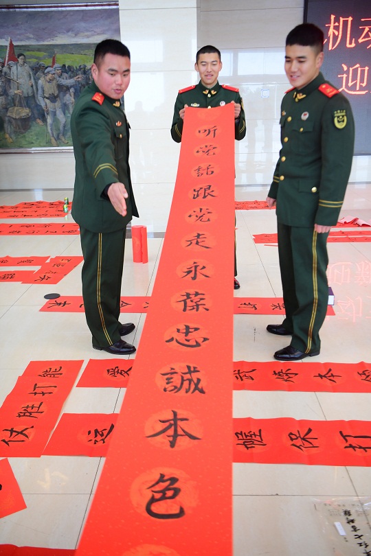 1月27日,武警江西总队机动支队组织书法爱好者为基层大、中队官兵写春联、送福字,喜庆祥和迎春节。