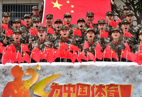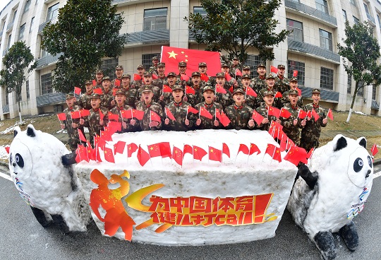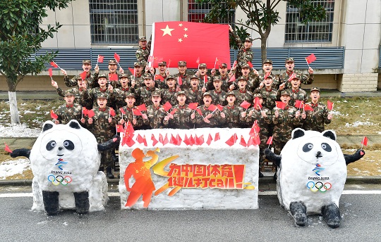 “为中国体育加油!为奥运健儿加油……”2月8日,武警湖北总队执勤支队官兵在休息时间用积雪堆出吉祥物冰墩墩,手持国旗集体打卡,为冬奥健儿加油,鼓励大家学习奥运精神,矢志练兵备战。