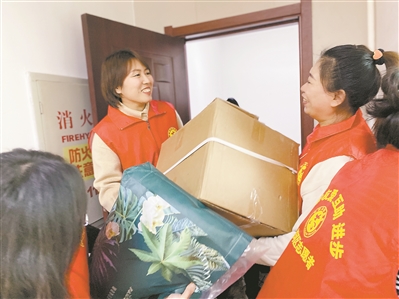 罗雅楠(左二)所在社区,是群众公认的环境美、生活美、心灵美“三美”社区。平时,她常与志愿者一起关爱社区孤寡老人,为他们提供帮助。邵天亮 摄