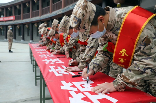 图为新兵在“筑牢法治之基,开启军旅征程”条幅上签名。