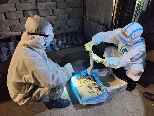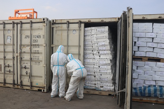 3月13日17时许,江门海警局根据情报获悉,在江门市黄茅海对开海域有走私活动。该局立即派遣2艘执法艇前往目标海域进行查缉。当日18时许,该局执法员通过AIS在目标海域发现一艘可疑船只,遂即拉响警报,表明身份,责令可疑船只立即停船接受检查。在可疑船只停船后,经执法员登临检查发现,该船舶上装载有29个长20英尺的集装箱,集装箱中载有大量冻品,冻品外包装上均有明显的外文标识,由于天气炎热且船上没有任何冷链保存装置,部分冻品已出现腐败发臭迹象,随船未发现该批冻品任何合法来源和检验检疫证明,执法员随即将涉案船舶及所载冻品依法进行查扣。