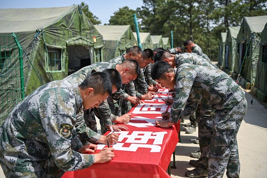 图为官兵在“强化国家安全意识 推进强军兴军伟业”条幅上签名。