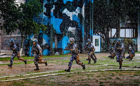 图为突降大雨,但陆战队员士气高昂冲锋在前。