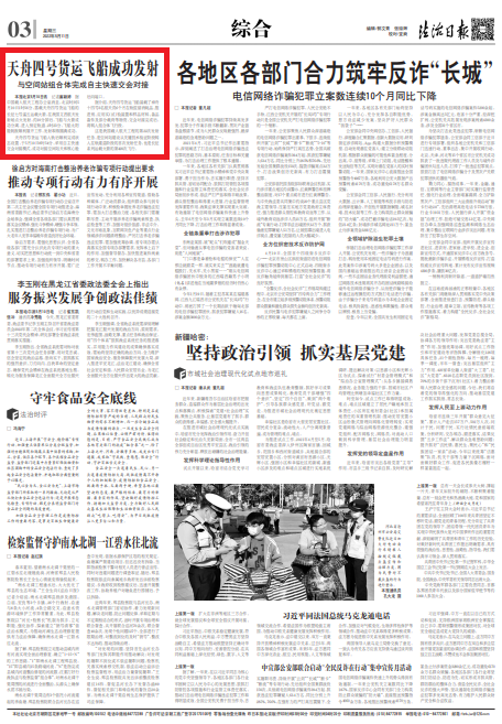 据介绍,天舟四号货运飞船装载了神舟十四号3名航天员6个月在轨驻留消耗品、推进剂、应用实(试)验装置和样品材料、备品备件及部分载荷等物资,交会对接完成后,将转入组合体飞行段。