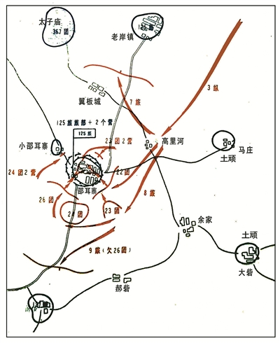 18日16时30分,第7、第9两旅按纵队赋予的任务,进至预定地区。第8旅(配属第26团)由30多公里外向邵耳寨急进。23时,第22团第3、第7连到达距邵耳寨1.5公里的鬼王庄,俘敌警戒分队1个排。半小时后,部队按预定时间对邵耳寨之敌进行了秘密包围。