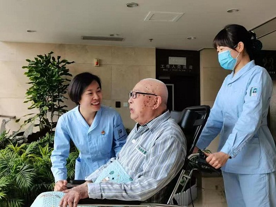 图为高锐(左一)照护高龄住院患者。汪学潮 摄