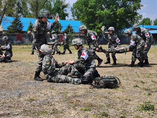 救护演练现场硝烟弥漫,数名战士“中弹受伤”。战斗间隙,高锐背着急救“卫生员背囊”第一个冲进硝烟,借助战场搜救系统快速找到伤员,娴熟处置伤口。她将伤员固定在软体担架上后,拽着担架侧姿匍匐前进,把伤员转移到安全地带。