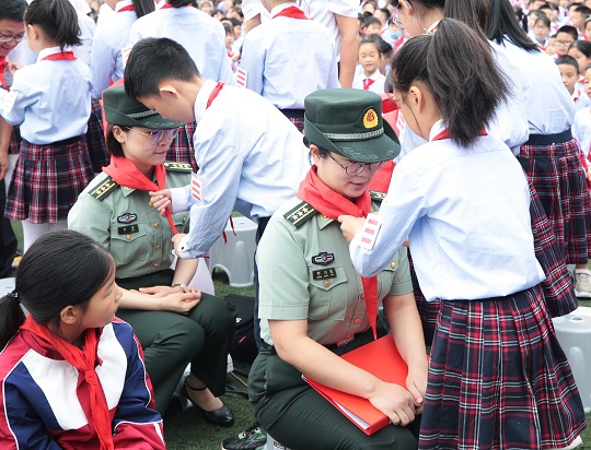图为2021年,孩子们为资助自己的某部官兵系上红领巾。朱一韬 摄