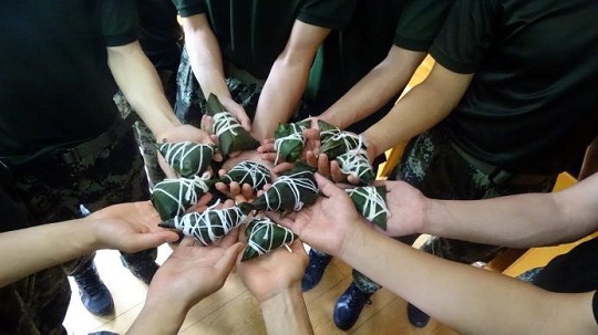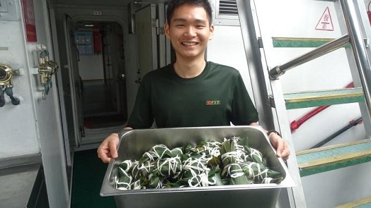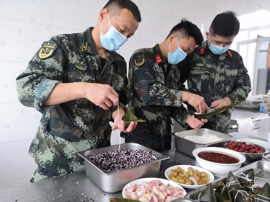 傍晚,结束任务的执法员们在餐厅自己动手包粽子。“这是我第一次学着包粽子,虽然包得奇形怪状,但是我觉得特别有意义。”执法员小李笑着说。