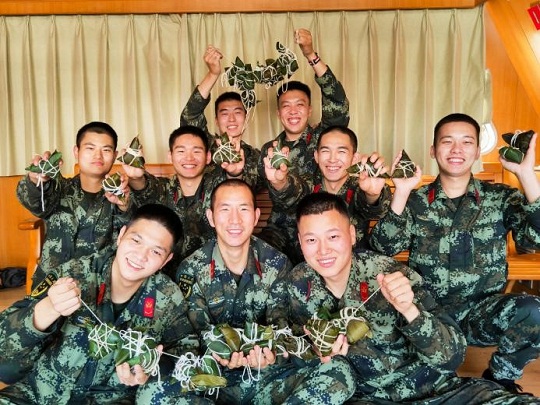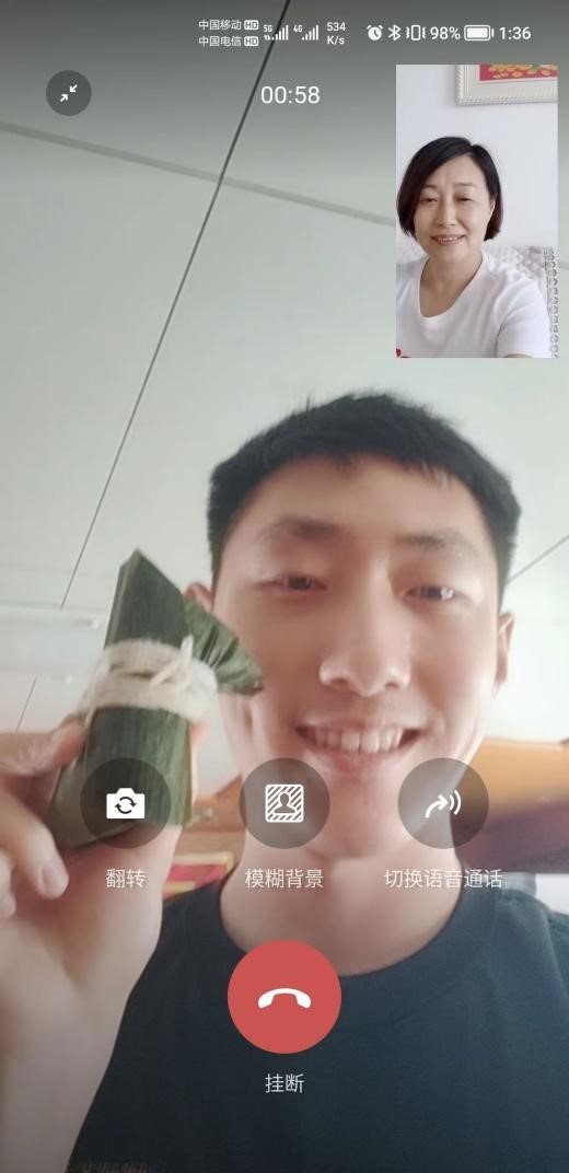 和妈妈拨通了视频的执法员小王高兴地炫耀着手里的粽子:“妈妈,端午安康,不用担心我,我在这边一切都好,你看这是我自己包的粽子。”