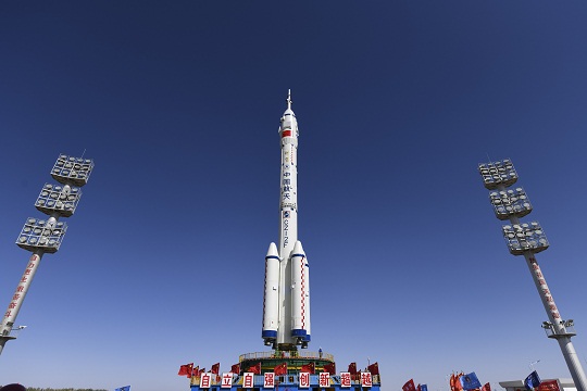 白色的长征二号F遥十四运载火箭,静静矗立在蓝色发射塔架旁。