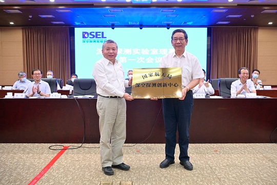 图为国家航天局局长张克俭(左)为深空探测创新中心授牌。张高翔 摄
