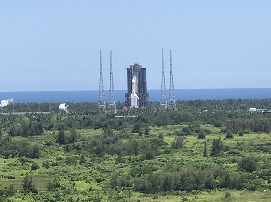 高大雄伟的发射塔架前,重约849吨、高约53.7米的“庞然大物”长征五号B遥三运载火箭蓄势待发。