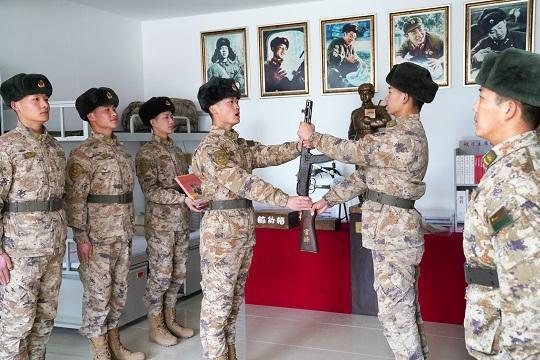 图为第79集团军某旅“雷锋班”班长牟振华(左四)将“雷锋枪”交接给新入班战士蒋佳恒(右二)。 张永进 摄