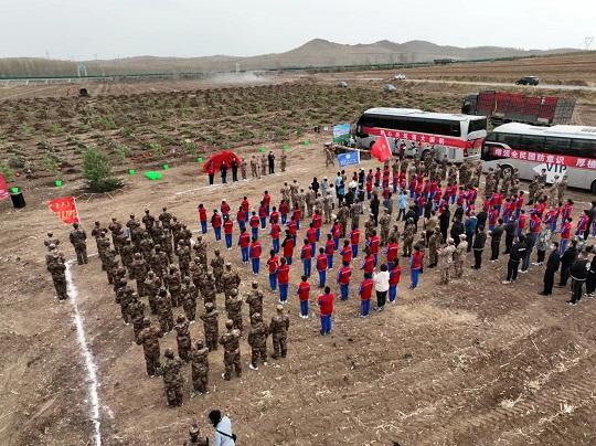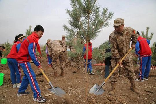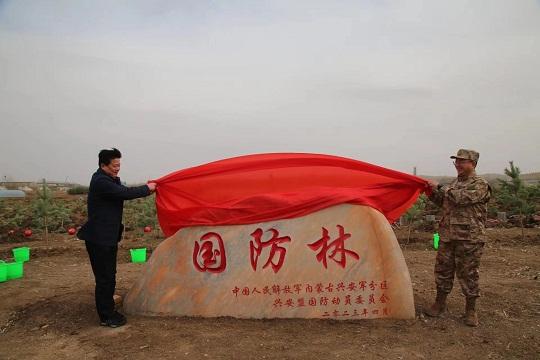 4月28日,在大兴安岭南麓科尔沁右翼前旗科尔沁镇,内蒙古兴安军分区联合兴安盟国防动员委员会举行“国防林”建设揭牌仪式和群众性植树活动,现役官兵、文职人员、民兵和部分学校师生,大家一同为绿色兴安充“植”。