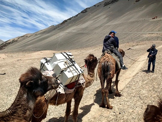 由于安装地点没有道路,而且需要翻越四千多米雪山,于是大家就雇了8匹骆驼将物资和仪器运至目的地。随着海拔升高,大家的高原反应越来越明显。张朝说,大家陆续感到头痛欲裂、呼吸困难、恶心呕吐……但是谁也不敢休息,相互搀扶或是轮流着骆驼,缓慢向山顶推进,只为赶在天黑前到达目的地。