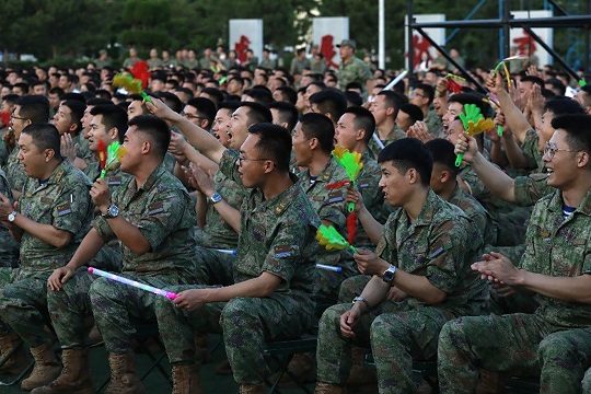 《岸训之歌》《壮志飞扬》《渴望光荣》《鲸港尖兵》等,演唱中灵活加入旗语、舞蹈、捧灯等元素,让真情流露,让情感升华。