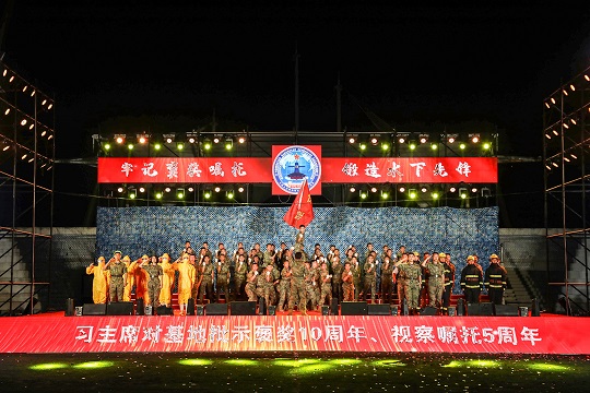 随着音乐缓缓响起,来自援建单位湖北十八洞村八一爱民学校学生走上舞台,与官兵齐声合唱《不忘初心》。