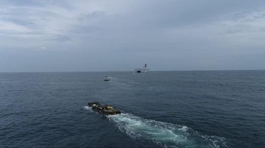 图为粤东某海域,第74集团军某旅与海军某部联合组织浮渡装卸载训练。颜新建 摄