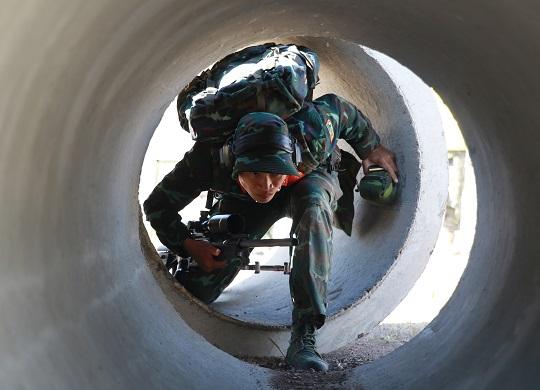 狙击手素有“枪王之王”的美誉,每一个“枪王”都是在极限挑战、与高手较练中练出来、打出来的。潜行狙击课目,要求狙击小组120秒内,在160米至350米远距离,携带弹匣和2个背囊协同依次通过低桩网、排水管道,利用狭小管道对半遮蔽头部靶进行射击。