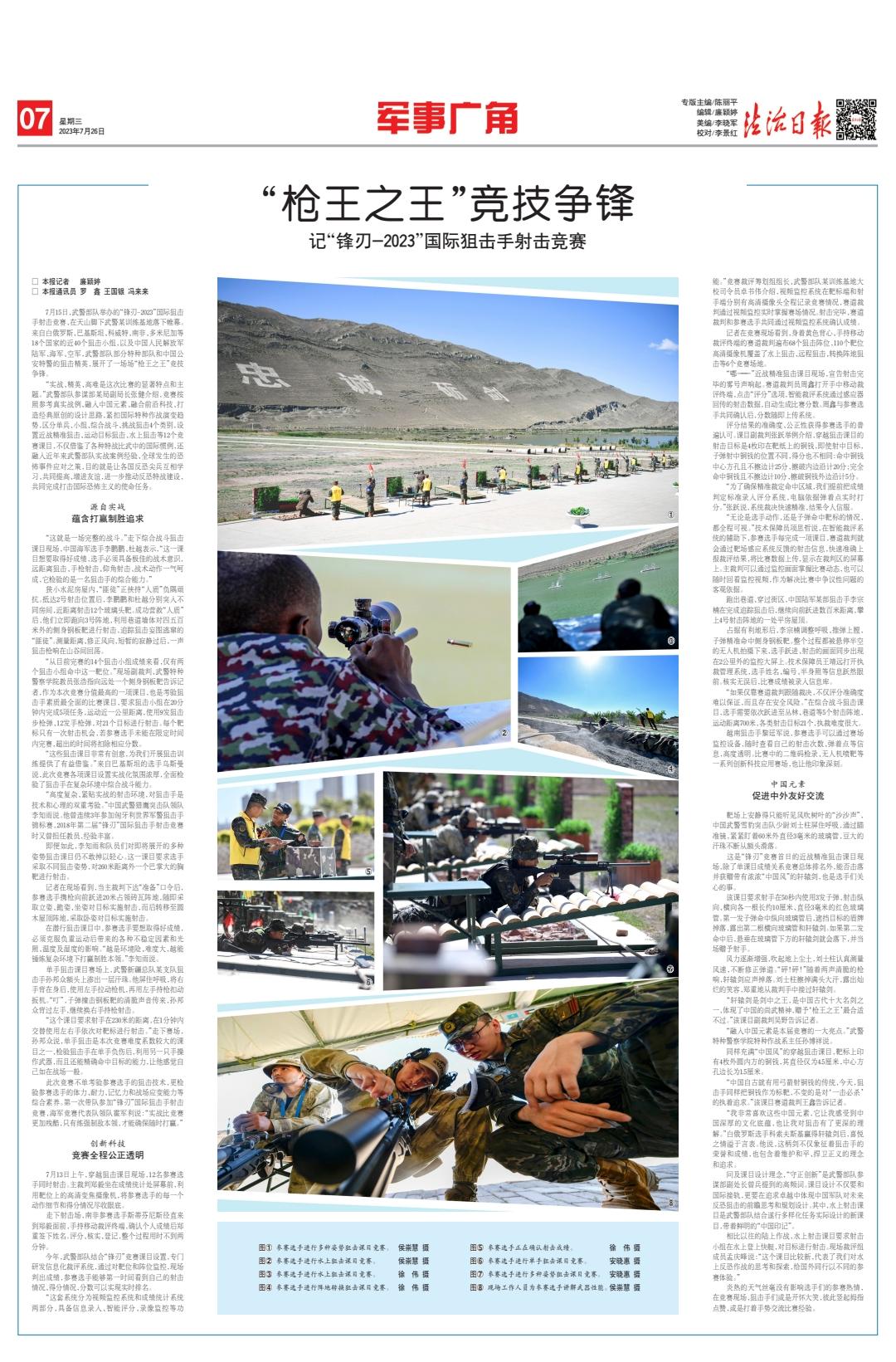 7月15日,武警部队举办的“锋刃-2023”国际狙击手射击竞赛,在天山脚下武警某训练基地落下帷幕。来自白俄罗斯、巴基斯坦、科威特、南非、多米尼加等18个国家的近40个狙击小组,以及中国人民解放军陆军、海军、空军,武警部队部分特种部队和中国公安特警的狙击精英,展开了一场场“枪王之王”竞技争锋。