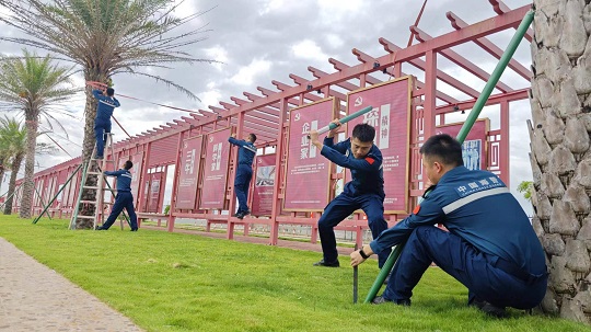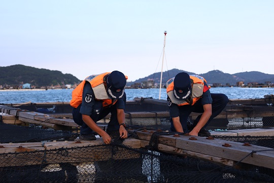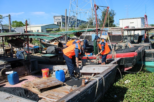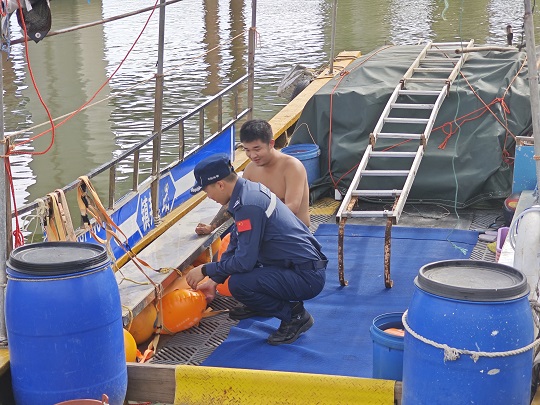 图为帮助渔民做好加固缆绳,检查船体设备。