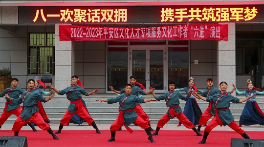 本次活动由武警青海总队文艺轻骑兵、青海省演艺集团、海西歌舞团等进行表演。文艺演出在雄壮震撼的歌舞《向着伟大的梦想》中拉开帷幕,情景表演唱《祖国召唤,我喊到》、舞蹈《追风》《我的铁甲梦》、红歌联唱《十送红军》《英雄赞歌》《不忘初心》、音乐快板《强军征程新风貌》、马头琴演奏《草原欢歌》、川剧《变脸》等节目轮番上演。