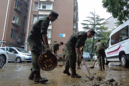 8月1日,北京市门头沟区受连续暴雨和山洪影响,大量泥沙、草木堆积在河道两侧和市区道路,严重阻碍交通出行。中部战区空军某部组织官兵赴街道社区,参与清除淤泥和垃圾20 余吨,积极配合驻地开展应急支援和灾后秩序恢复工作。