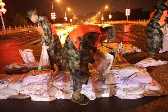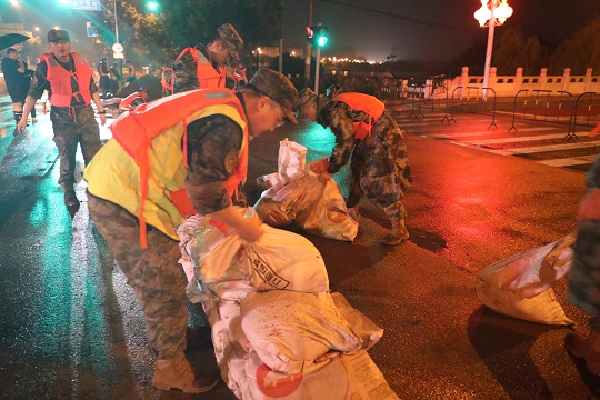 7月31日至8月2日,北京市怀柔区怀河水位持续高涨,中部战区空军某部组织防汛分队,赴怀柔区大杜两河村大桥和庙城镇进行支援,开展防汛沙袋装填、防汛墙构筑等工作,配合地方快速控制汛情蔓延。