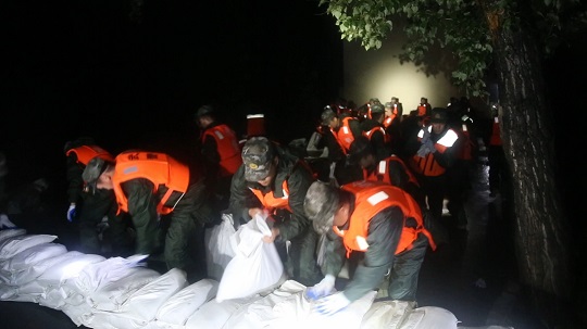5日凌晨1时20分,官兵们到达现场后迅速展开战斗,每5人为一个小组,分别负责沙袋填充、搬运和铺设等工作。官兵克服困难,在黑夜中连续奋战4小时,在镜泊湖水库周边垒筑沙袋近千余个,筑起0.6米高阻隔沙袋200余米。保证了驻地群众生命财产安全。