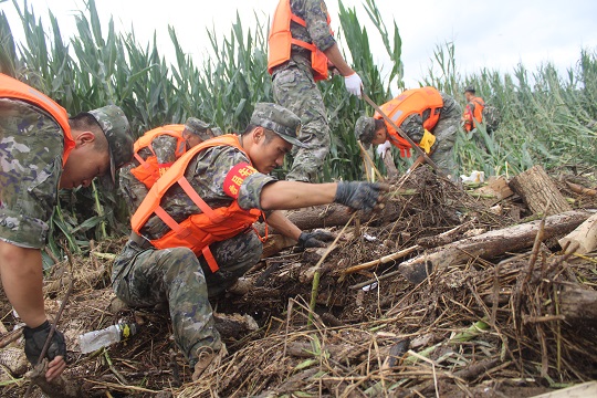 图为武警吉林总队吉林支队官兵对珠琦河沿岸汇聚的沉积物下方进行重点搜寻。