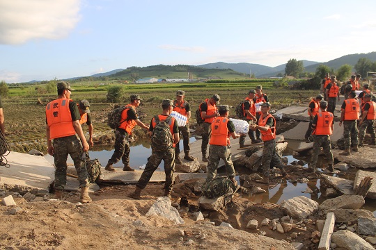 图为武警吉林总队吉林支队官兵用人桥代替石桥接力搬运救灾物资。