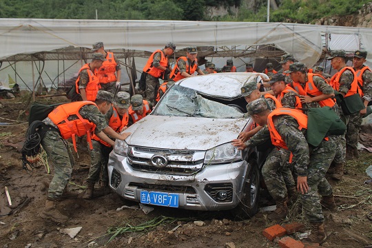 图为武警吉林总队吉林支队官兵合力推行车辆,转移被困群众。