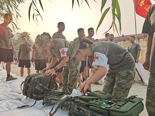正午时分,天气闷热。连续奋战近8个小时,“模范卫生队”特诊技师、二级上士赵鑫的衣服干了又湿,脸颊和胳膊晒得通红。除了担负全旅的卫勤保障任务,赵鑫和连队其余9名女兵主动请战:挺在一线,装沙筑堤。“男兵能干的我们都能干。”赵鑫说。