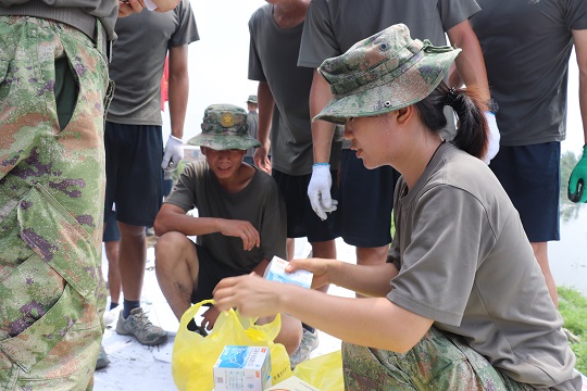 放下锹镐,她是医疗救护员,拿上锹镐她一名抗洪战士。“模范卫生队”女兵彭舒杰一直冲锋在抗洪抢险任务一线,鞋子上粘满泥土无法动弹,她就跳入泥坑挽起裤脚,赤着脚在淤泥水坑里装沙搬运。洪水堵住了,她也变成了“泥人”。可她依然把这句话挂在嘴上:“我是‘铁军’传人,一定要尽最大努力保证人民群众安全”。