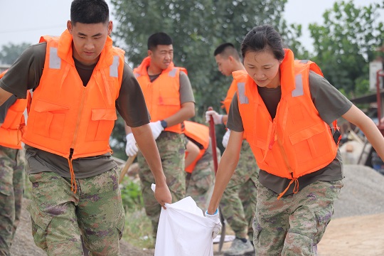 大清河大堤上,顶着30多摄氏度的高温,“铁军旅”卫生连女兵走上堤坝,与男兵们一起装填沙袋、搬运沙袋。她们中,有的瘦弱的只有40公斤。8月8日至9日,她们平均每人装运7.3立方土、245个沙袋,每人装运7350斤……