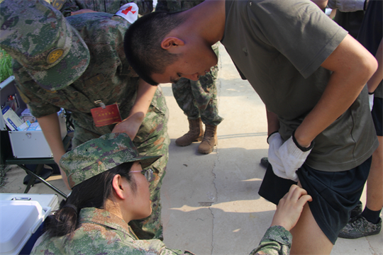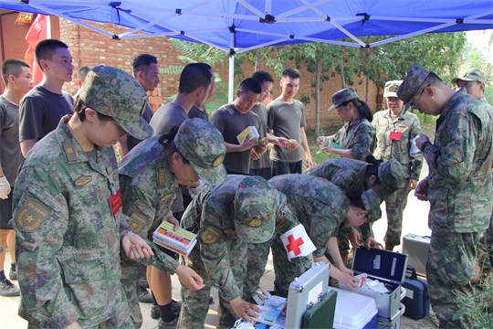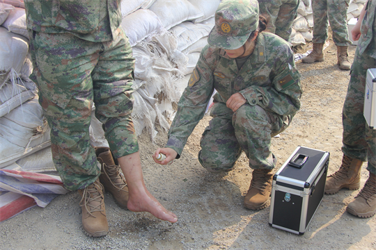 医疗队抵达任务区域后,队员们展开医疗救治工作。前线的战士们由于蚊虫叮咬和洪水长期浸泡,部分官兵出现感冒中暑、腹泻湿疹、扭伤擦伤、皮肤溃烂等伤病情况。医疗队迅即展开诊疗,对患病官兵开方拿药,对尚未患病官兵讲授预防,仅第一日便巡诊180人次,处理伤口6人,开展健康防护科普宣教3场次。