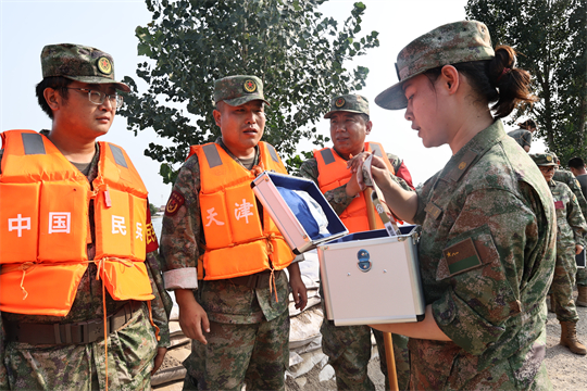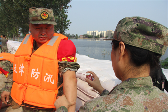 根据上级统一部署,天津警备区干休所“轻骑兵”特色医疗队依令抵达天津市静海区台头镇,对抗洪一线解放军、武警官兵、民兵进行医疗巡诊和紧急救治。