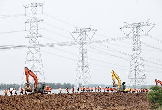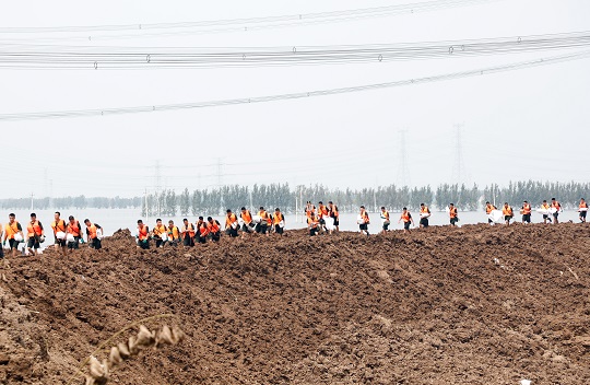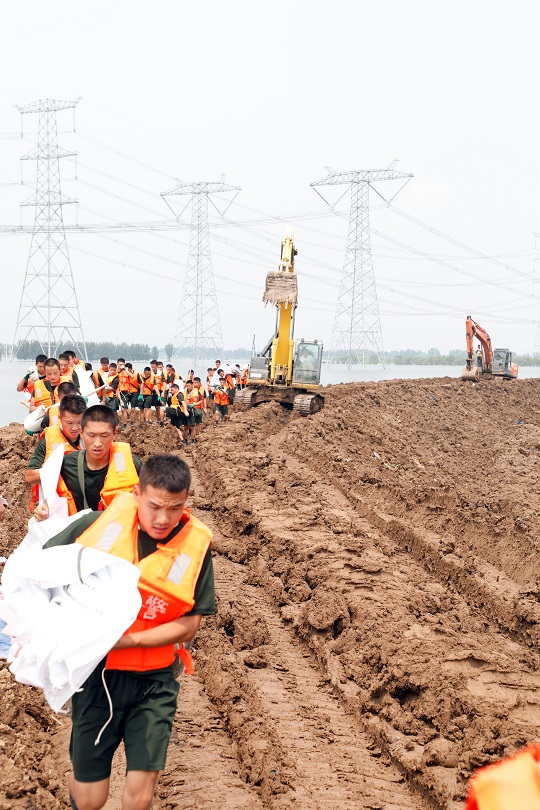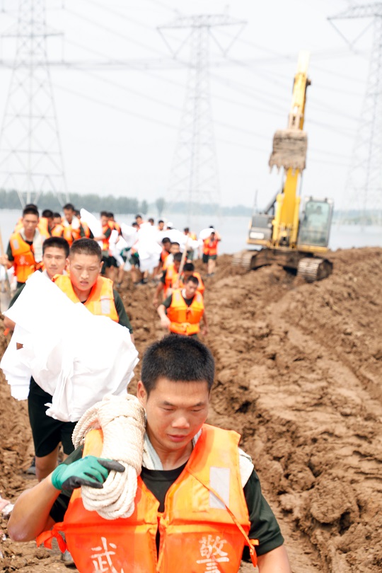 8月11日,天津市静海区王口镇大清河支渠南段发现多处管涌渗水,武警第一机动总队某支队官兵迅速前往开展抢险作业,成功封堵管涌。图为官兵们紧急奔赴抢险点。