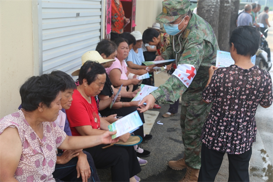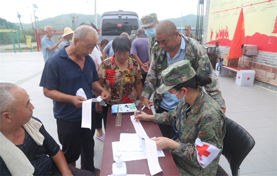 8月9日一早,河北省军区石家庄第三干休所医疗服务队携带血压计、心电图机、血糖检测仪等医疗设备驱车一百多公里,来到太行山深处的革命老区——河北省赞皇县黄北坪村,为刚刚受到暴雨山洪侵袭的村民进行健康体检、常见病筛查及灾后防疫宣讲。
